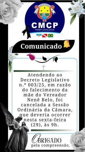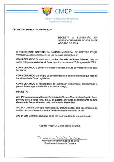 Conforme o Decreto nº 003/2025, nesta sexta-feira (29 de agosto), não houve Sessão Ordinária na Câmara em razão do falecimento da mãe do Vereador Nenê Belo (Republicanos), a Sra. Geralda de Souza Oliveira, declarado pelo Poder Legislativo em sinal de pesar. Os serviços administrativos funcionaram normalmente.